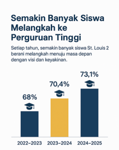 Peningkatan jumlah siswa yang melanjutkan studi ke perguruan tinggi setiap tahunnya menjadi bukti nyata bahwa SMA Katolik St. Louis 2 tidak hanya melahirkan siswa berprestasi, tetapi juga siswa yang memiliki arah hidup dan keyakinan dalam menentukan masa depannya. Dengan dukungan penuh dari guru, tim BK, dan lingkungan belajar yang positif, sekolah terus membangun budaya akademik yang kuat dan manusiawi dimana siswa didampingi tidak hanya untuk berhasil secara akademik, tetapi juga bertumbuh secara utuh sebagai pribadi.